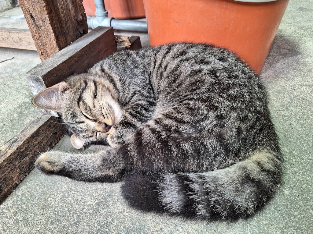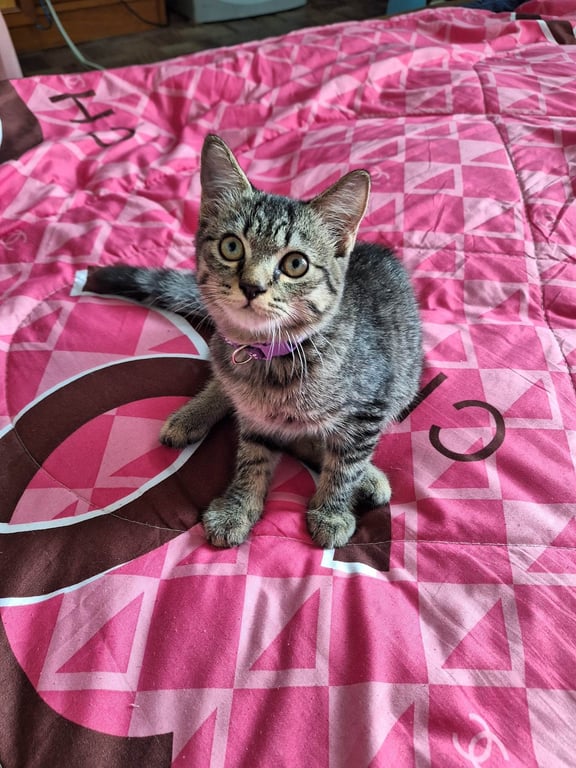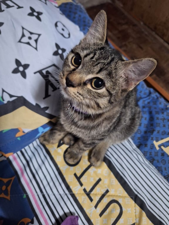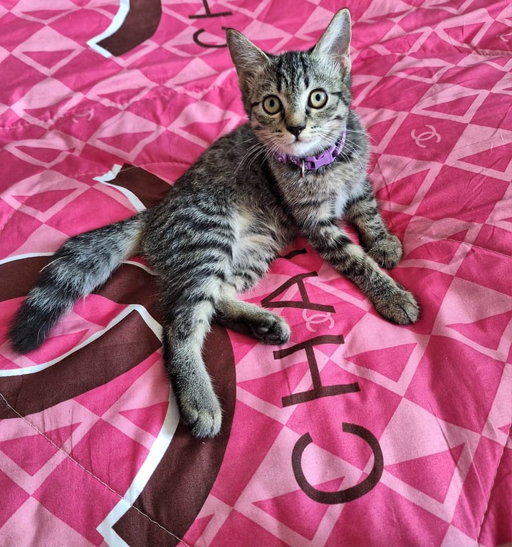 รอยตำหนิ: หางกวัก หางฟูๆ ใส่ปอกคอสีม่วง