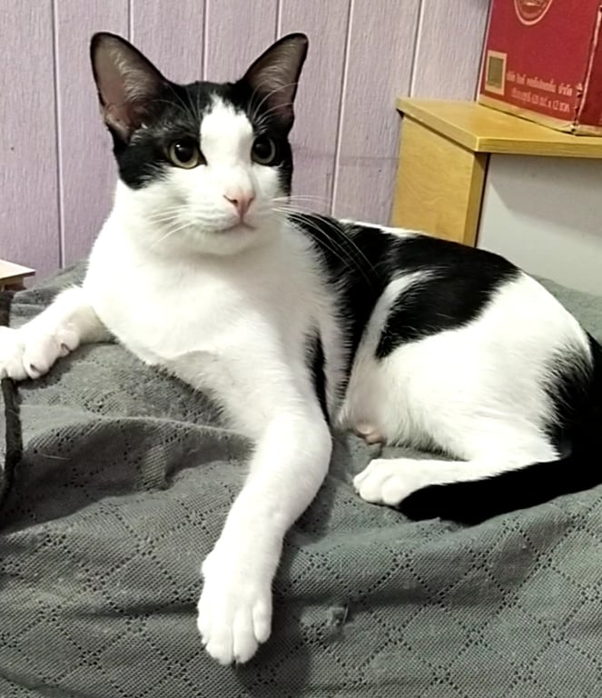 รอยตำหนิ: น้ำหนักประมาณ 5-6 โล หางยาว ลายวัว ตรงช่วงเอวเหมือนหัวใจสีดำ ไข่ 2 สี ฟีบๆ ตรงหน้าผากคิ้วบาง ตรงกลางสามเหลี่ยมขี้อ้อน ชอบเลียจักกะแร้ เป็นมิตรมากเกินไป ไม่ขี้กลัว
