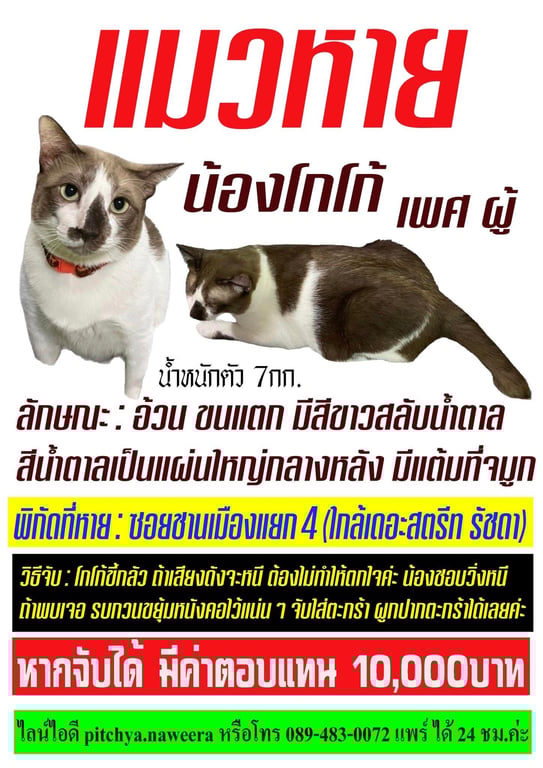รอยตำหนิ: อ้วน หนัก 7 กิโล ขนแตก มีแต้มน้ำตาลที่จมูกนิสัย : ขี้กลัว ตื่นคน ชอบซ่อนตัว อาจจะซ่อนตามซอก หากเข้าใกล้อาจจะตื่นกลัวและวิ่งหนี จับตัวได้ยาก วิธีจับ : โกโก้ขี้กลัว ถ้าเสียงดังจะหนี ต้องไม่ทำให้ตกใจค่ะ น้องชอบวิ่งหนี ถ้าพบเจอ แจ้งพิกัดเจ้าของได้เลยค่า หรือหากจับได้รบกวนขยุ้มหนังคอไว้แน่นๆ จับใส่ตะกร้า ผูกปากตะกร้าได้เลยค่ะ