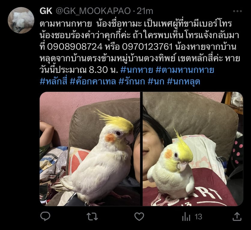 รอยตำหนิ: ที่หัวด้านหน้ามีรอยดำๆเพราะชอบไปซุกใต้ตู้น้องชอบร้องเพลงคุกกี้ และเอาขาเคาะกับสิ่งของ ชอบหัวเราะ