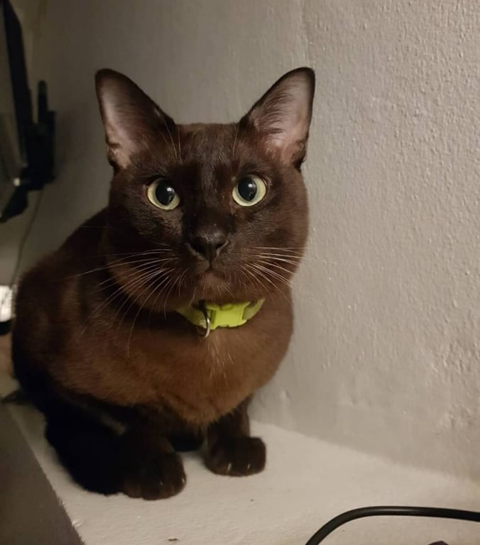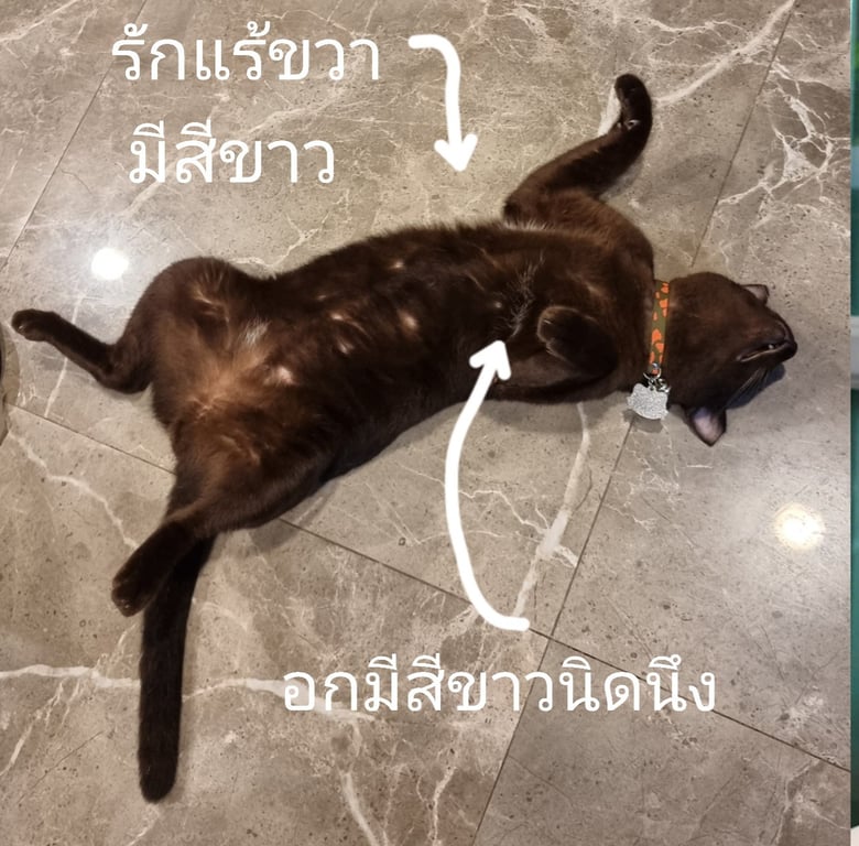 รอยตำหนิ: รักแร้ขวา มีขนสีขาว อกซ้ายมีขนสีขาวน้ำหนักประมาณ 5.5 กิโลกรัม ตัวอ้วนกลม หางยาวปกติ นิสัยขี้อ้อน เจอคนไม่ค่อยหนี เป็นมิตร ไม่ดุ