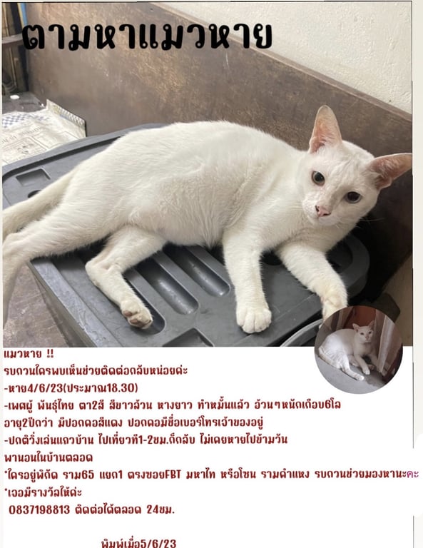 รอยตำหนิ: ตรงหัวมีรอยจุก2จุด จางๆแมวไทย ขาวมณี ตัวอ้วนๆตา2 สี สีขาวล้วน เพศผู้ นิสัยจะขี้กลัวนิดนึง ถ้าไม่คุ้นน้องอาจจะวิ่งหนี ขี้ตกใจ ปกติน้องจะอยู่แค่บริเวณบ้าน ไปเที่ยวนานสุด1-2ชม.ก็กลับมา ไม่เคยหายไปนาน มีครั้งนี้ไม่รู่สาเหตุเลย