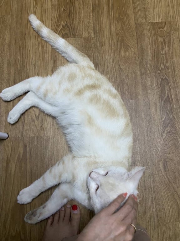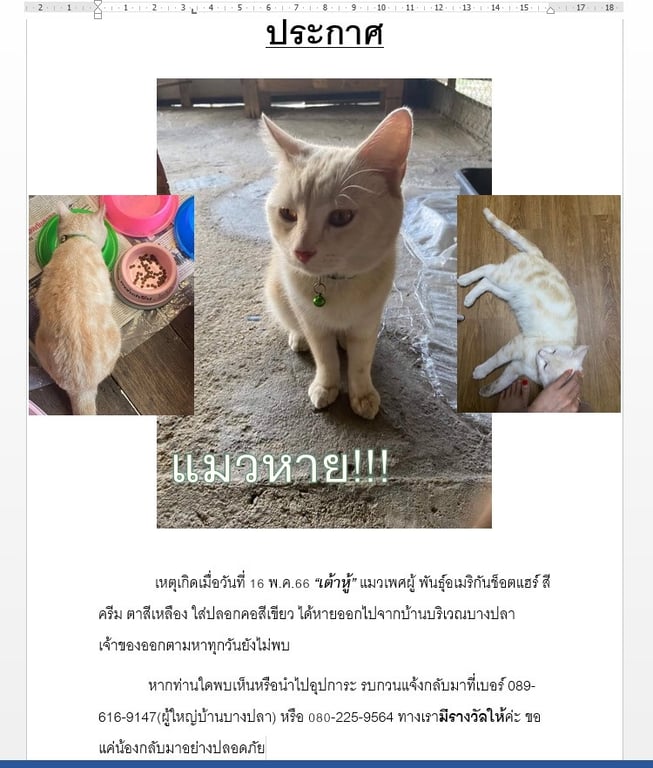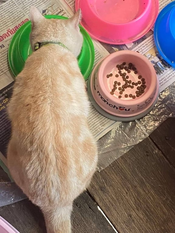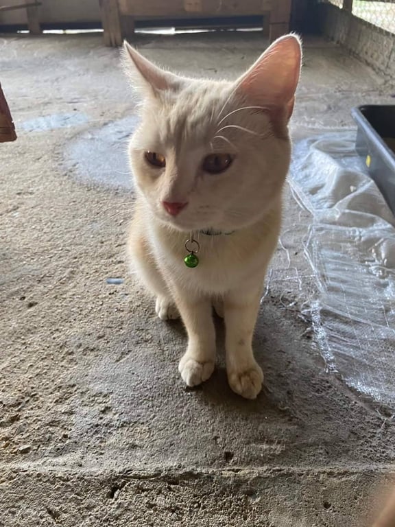 รอยตำหนิ: ตาสีเหลือง ปลอกคอมีกระดิ่งสีเขียวน้องไม่ดุ ไม่ขู่ ชอบเข้าหาคน กินเก่ง