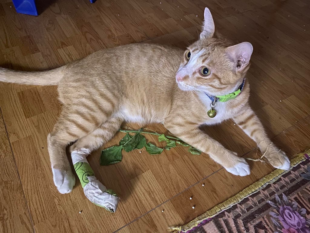รอยตำหนิ: ปลายหางงอเล็กน้อยสีขาวแซม สวมปลอกคอสีรุ้ง
