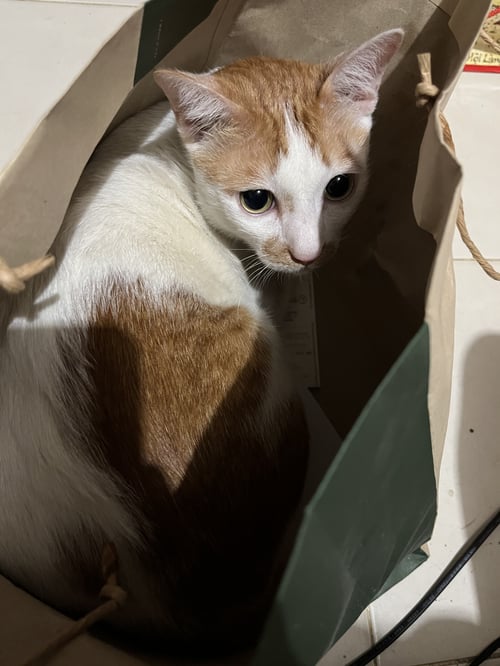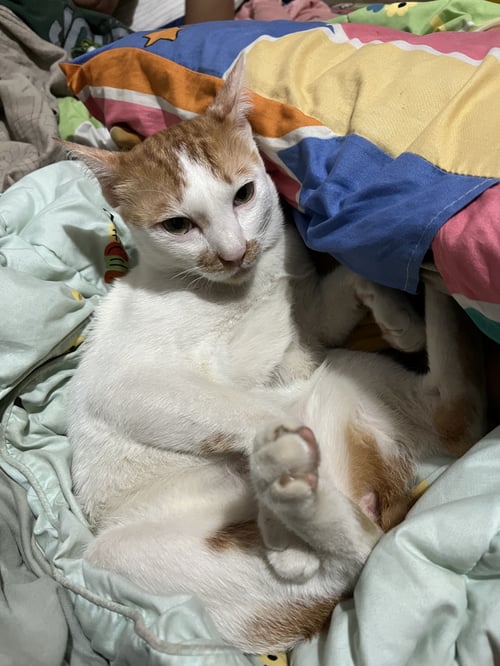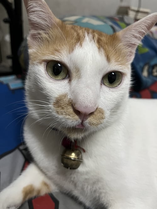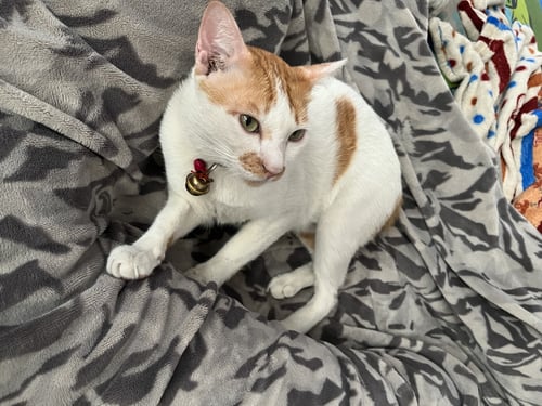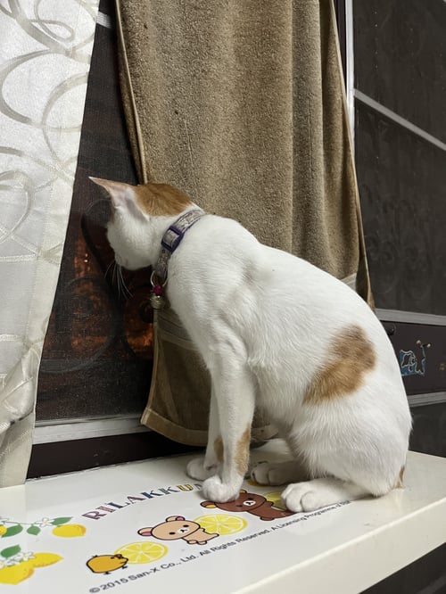 ใส่ปลอกคอสีม่วง, ตัวไม่ใหญ่มากน้ำหนักประมาณ 5 กิโลกรัม, ขี้อ้อนมากๆ ร้องเสียงน่ารัก ชอบนอนข้างคน ค่อนข้างกลัวคนแปลกหน้า