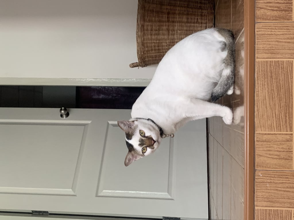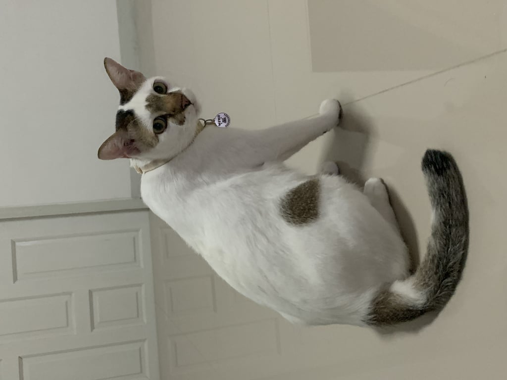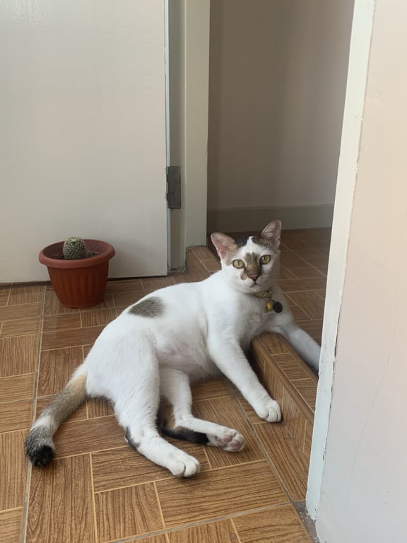 รอยตำหนิ: ช่วงตัวสีขาวแต่มีจุดสีน้ำตาลจุดเดียว อีกฝั่งไม่มีลายจุด ปลอกคอล่าสุดที่น้องใส่เป็นสีเทา-ดำนะคะ ไม่มีป้ายชื่อกลัวคนแปลกหน้าที่พุ่งเข้าไปใกล้ ถ้าค่อยๆเข้าไปใกล้จะไม่ค่อยกลัว แต่ส่วนใหญ่ชอบหลบคน แต่ถ้ามีอาหารแมวเลียแบบซองก็จะเริ่มคุ้นชินบ้าง
