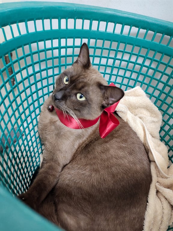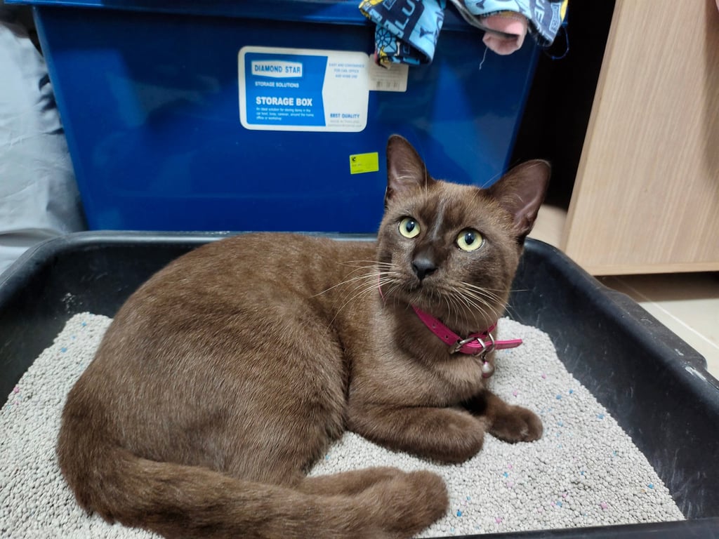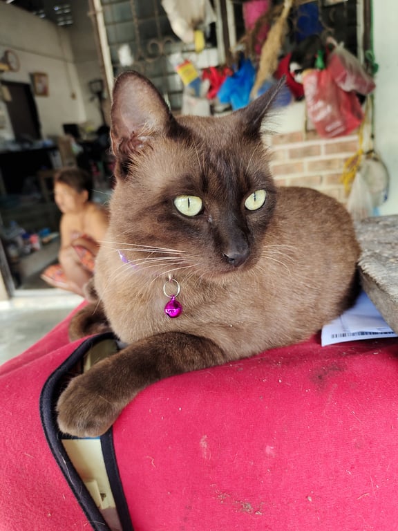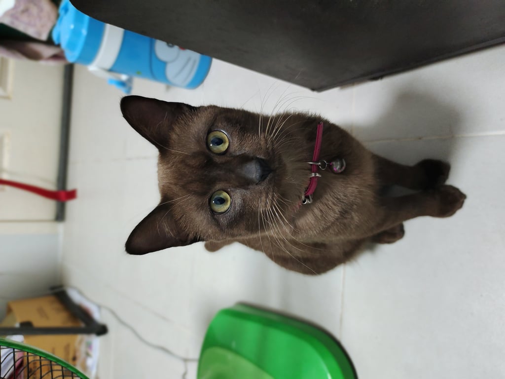 รอยตำหนิ: ใส่ปลอกคอสีม่วงลายเท้าแมวขี้อ้อน ซน ชอบสำรวจพื้นที่ อาจจะกลัวคนแปลกหน้า ไม่ค่อยสู้แมวตัวอื่น ชอบหนีออกจากบ้านหลายๆวันหรือเป็นอาทิตย์จะกลับบ้านมาเมื่อหิวมากๆ (หนีประมาณ2ครั้งแล้ว)