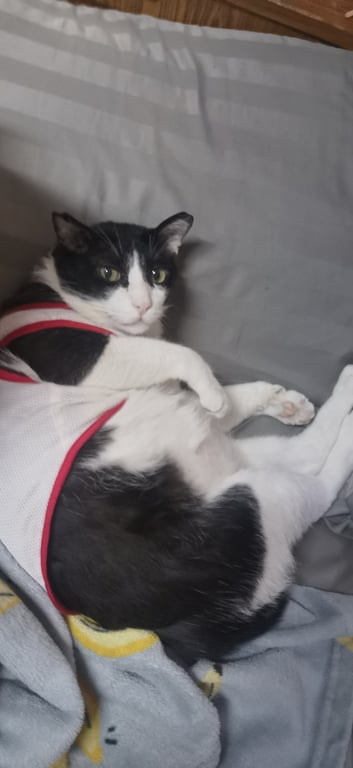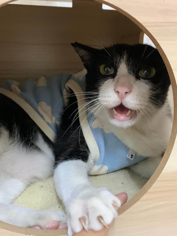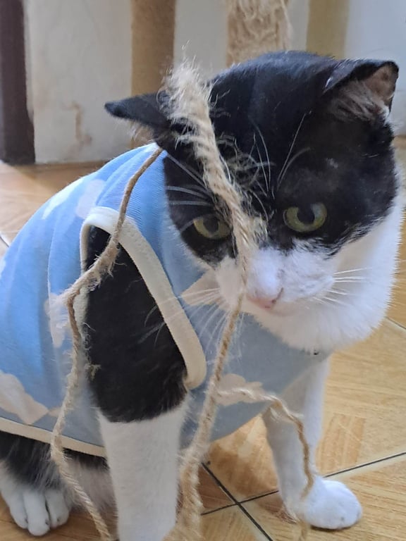 รอยตำหนิ: ตาเหลือง ตัวอ้วน หางกุด มีรอยขนล่วงเป็นจุดที่หลังคอน้องไม่กลัวคน ชอบวิ่งเข้าใต้รถ อ้อนคนแปลกหน้า ไม่ค่อยร้อง ชอบเล่นแรง ไม่ชอบให้อุ้ม
