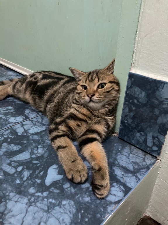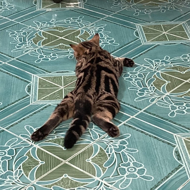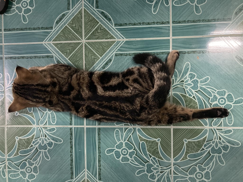 รอยตำหนิ: มีรอยแผลตรงไข่ ลายตรงหน้าผากรูปตัว Mชอบนอนขาหลังเหยียดตรง ขาหน้าพับเป็นปีกไก่