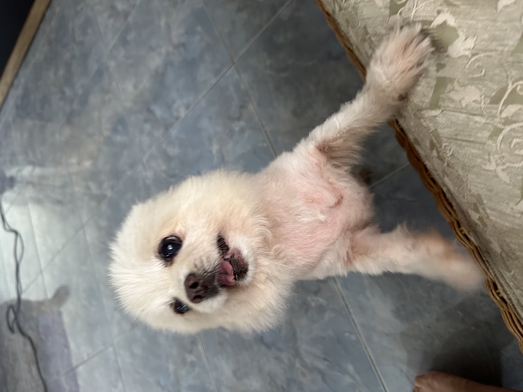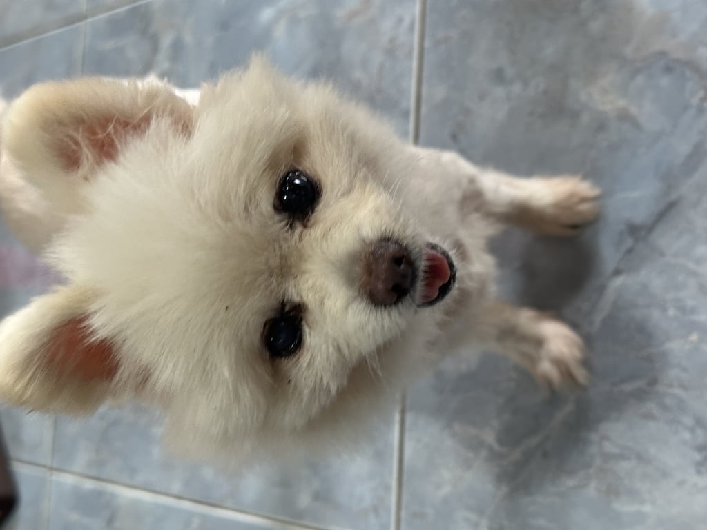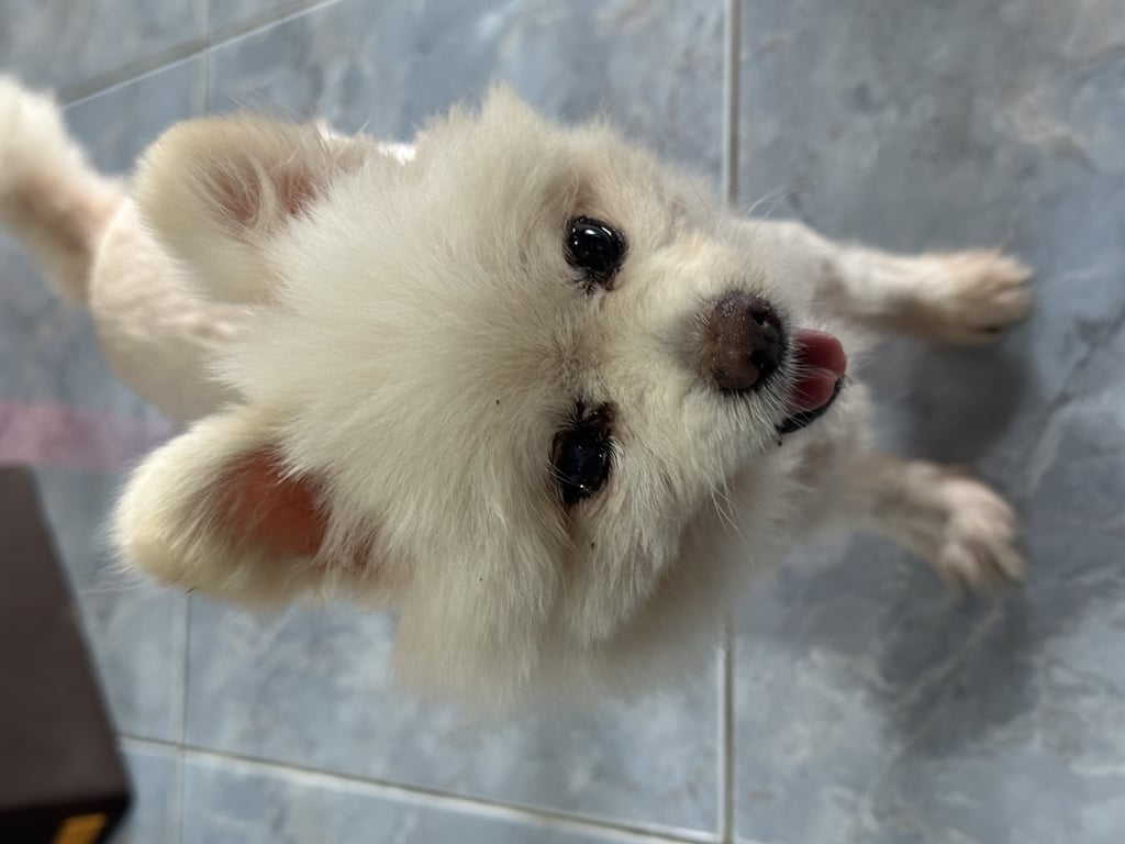 รอยตำหนิ: ขนที่ลำตัวไถเกรียน ส่วนหัวมีขนฟูๆนิดหน่อย ตาเริ่มมีต้อน้องเข้ากับคนง่าย เห่าบ้างบางครั้ง ไม่กินอาหารเม็ดแล้วชอบกินอาหารคน