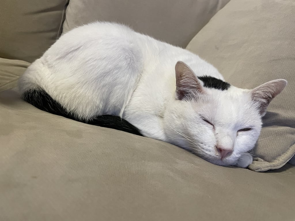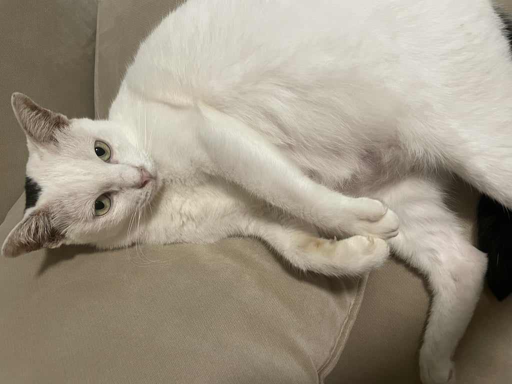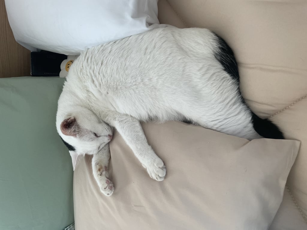 รอยตำหนิ: ตัวสีขาว หางสีดำ มีแต้มสีดำบนหัว รูปร่างอ้วนน้องค่อนข้างขี้กลัวค่ะ