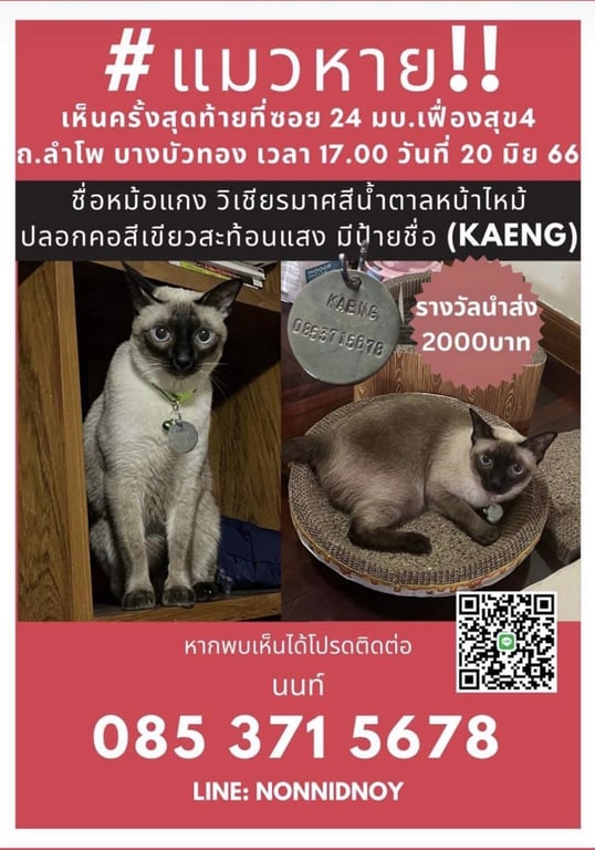 รอยตำหนิ: ปลอกคอสีเขียวสะท้อนแสง มีป้ายชื่อ Kaengน้องกลัวนแปลกหน้า ชอบขนมแมวเลีย ชอบทุเรียน