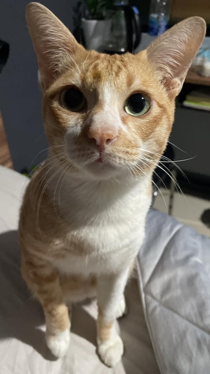 รอยตำหนิ: หางสั้นกุด หางกวัก เสียงร้องจะเหมือนแมวนักเลง5 ปี นิสัยขี้กลัว แต่ล่อด้วยขนมได้จะเชื่อง เสียงขู่กร่างๆ ไม่เข้าหาคน เวลาหลุดออกไปข้างนอก ชอบทำตัวเองให้ดูมอมแมม ปกติจะกลับมาบ้านเองได้ แต่ถ้าตามหาเจอก่อนรบกวนติดต่อเราและพากลับมาหน่อยนะคะ น้องเป็นโรคผิวหนัง มีตุ่มๆ กำลังจะพาไปรักษาพอดีแต่น้องหนีออกไปเที่ยวซะก่อน