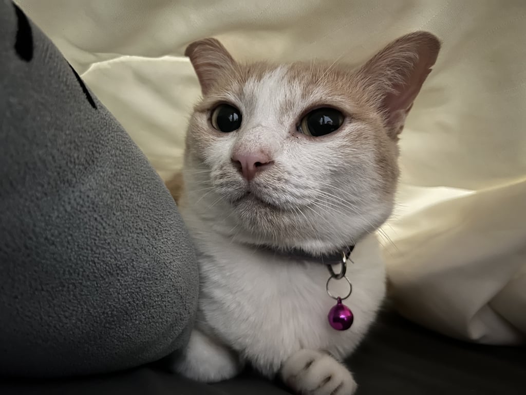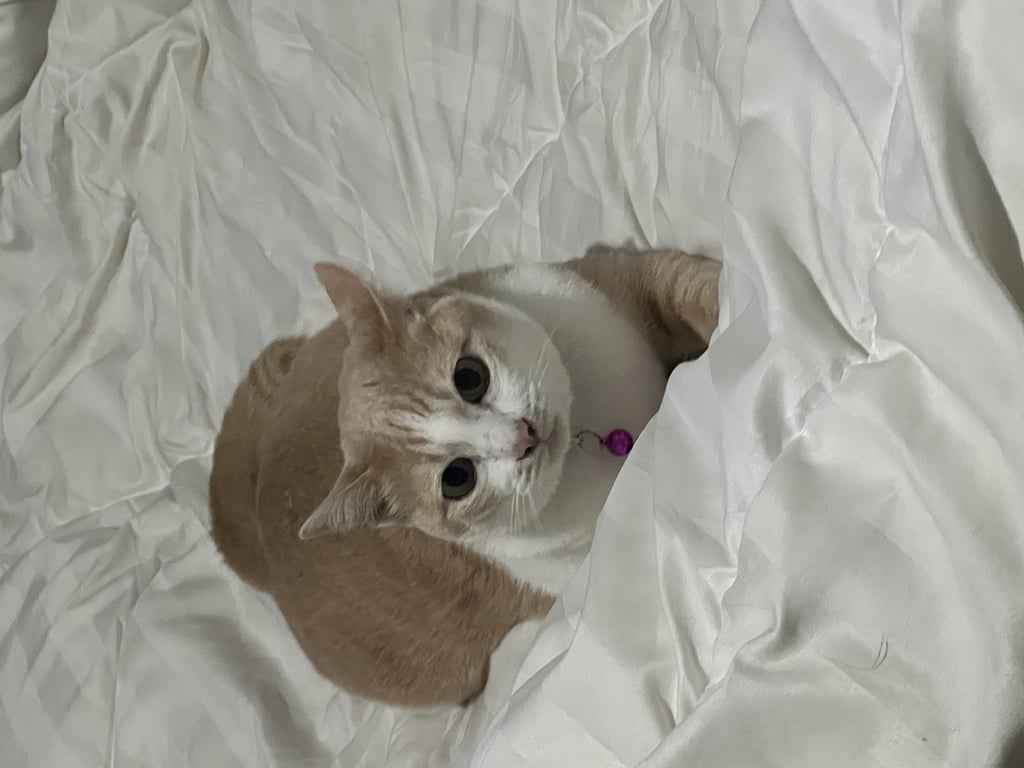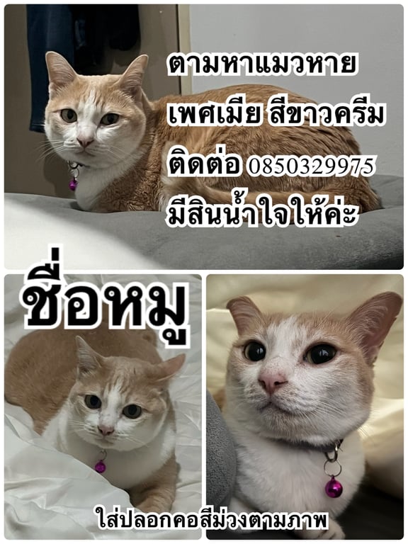รอยตำหนิ: ใส่ปลอกคอสีม่วง กระดิ่งสีม่วง ขาหน้าสองข้างเป็นสีขาวสลับครีมขี้กลัว ชอบมุดเข้าที่มืดแคบ ไม่คุ้นกับคนแปลกหน้านัก