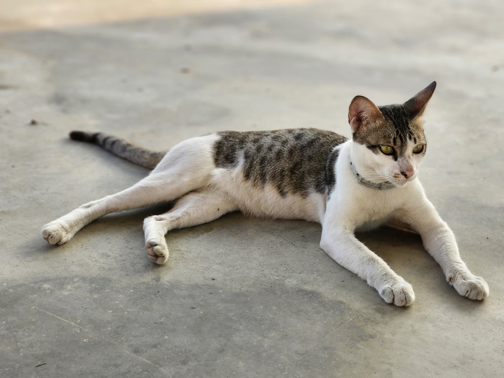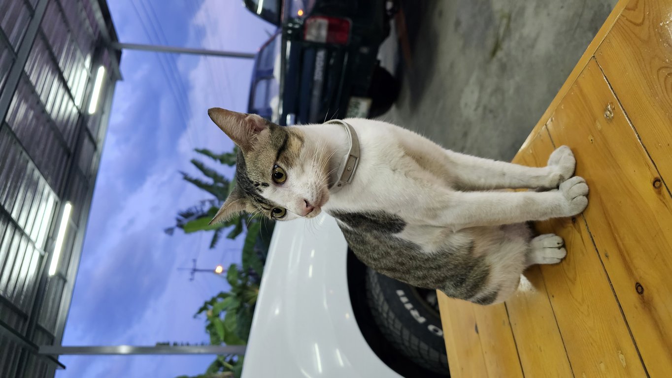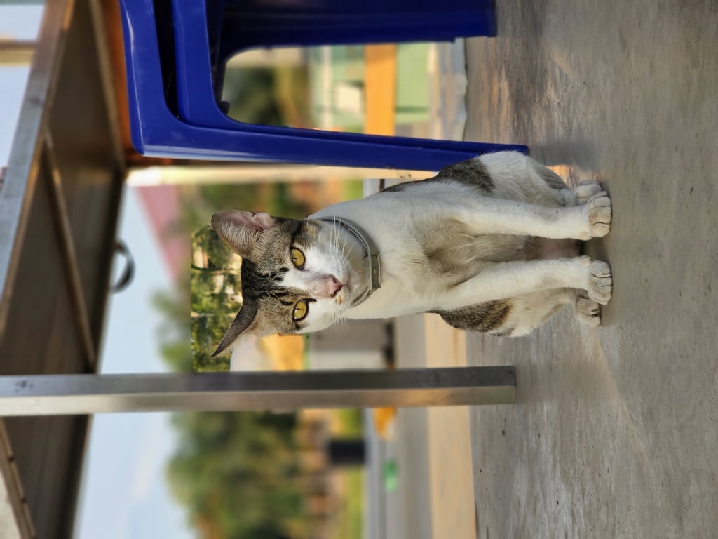 รอยตำหนิ: ลายสลิดไม่เต็มตัวมีปลอกคอสีขาวขี้อ้อน เป็นมิตร ตัวผู้ ยังไม่ทำหมัน