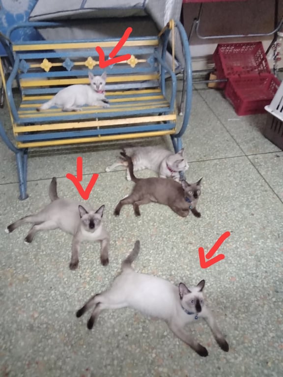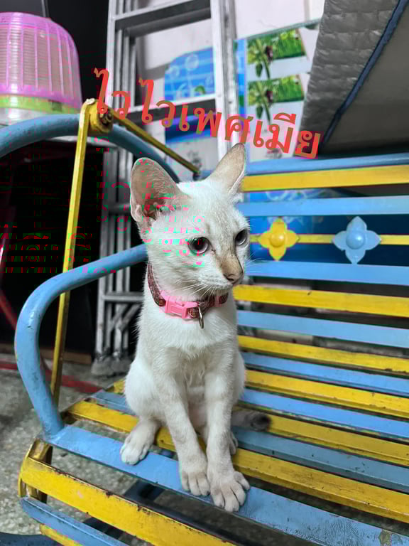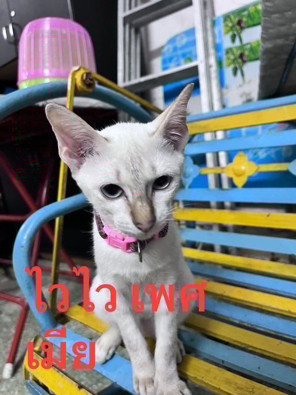 รอยตำหนิ: หน้าผากลาย M หางสั้น มีแต่มดำปลายหาง ตัวเล็ก ตาฟ้าอมเหลืองไวไว เพศเมีย นิสัยไม่ค่อยยอมให้จับแต่พอจับแล้วให้อุ้ม ปลอกคอสีชมพู ปลายหางมีแต้มดำ หน้าผากลายM ตัวเล็ก