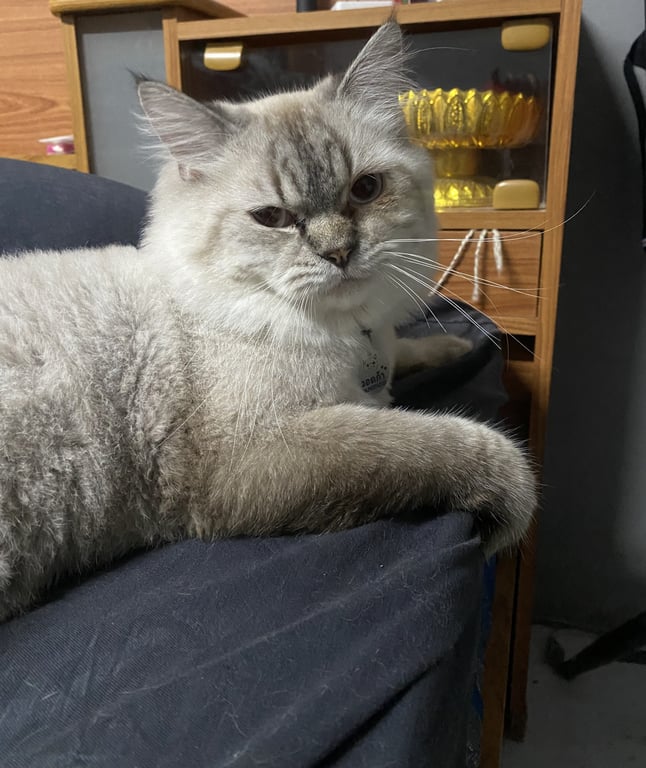 รอยตำหนิ: หน้าผากรูปตัว Mขนสั่น เนื่องจากตัดขนมา น้องกินบ่อย ชอบนอน กลัวคน กลัวหมา กลัวรถ ร้องไม่มีเสียง