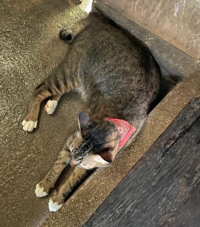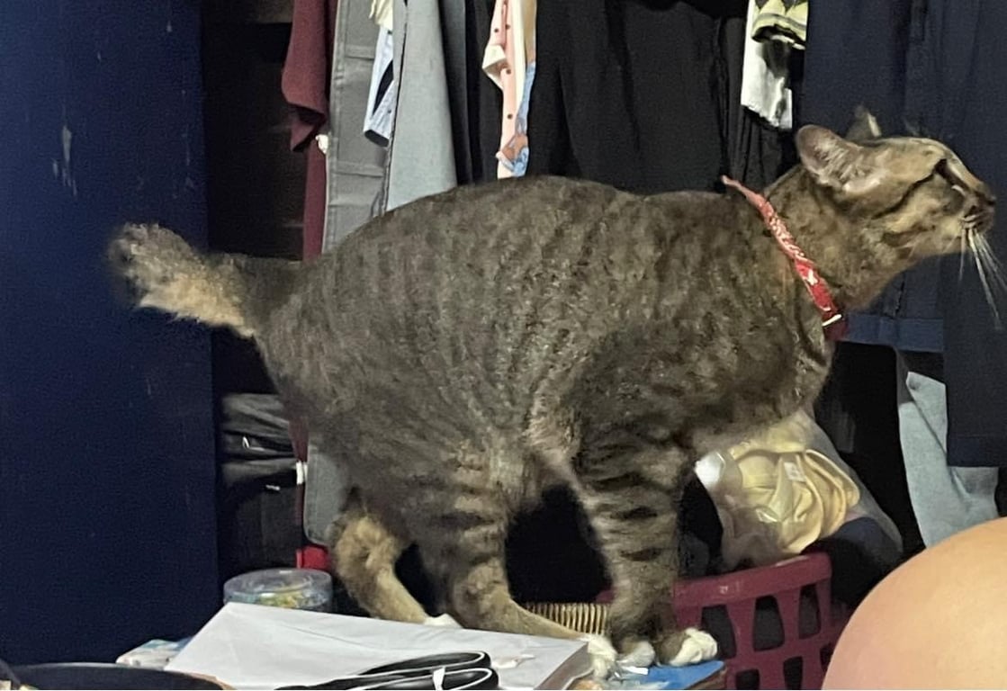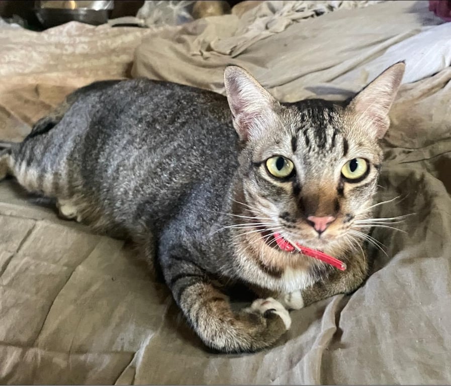 รอยตำหนิ: หางสั้น ม้วน มีตัว M ที่หน้าผาก ปลอกคอสีแดงตื่นคน กลัวเสียงดัง