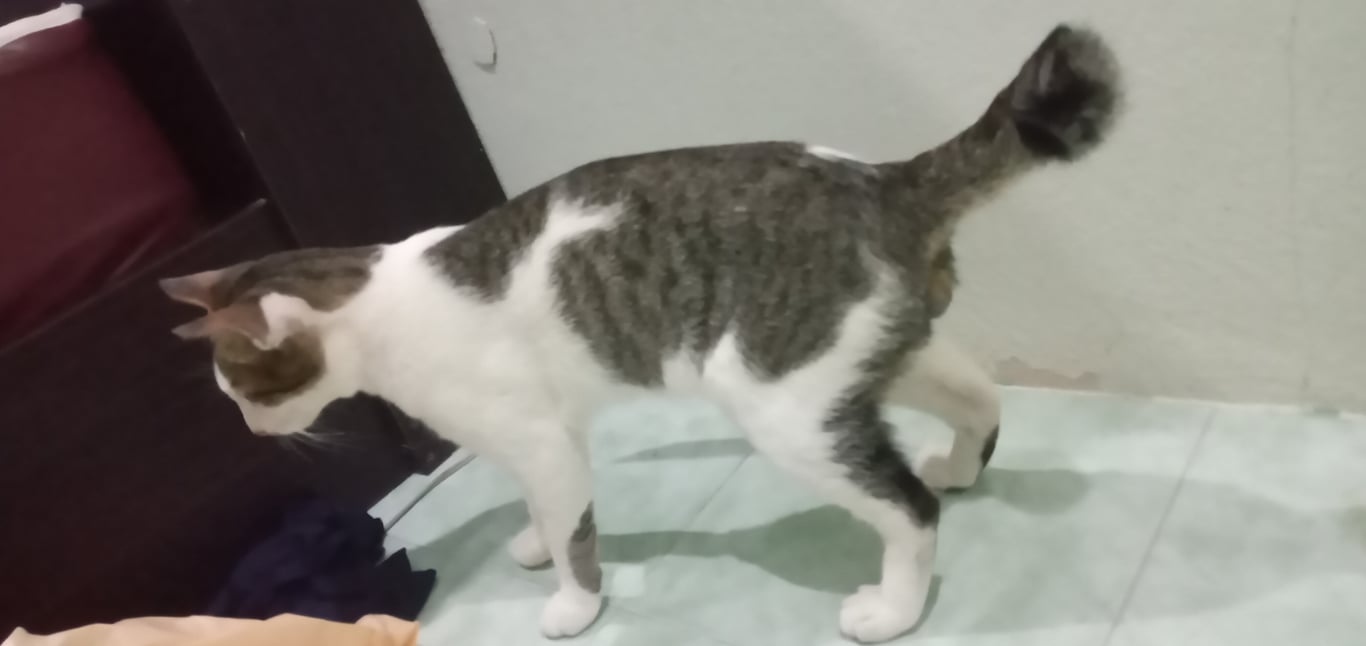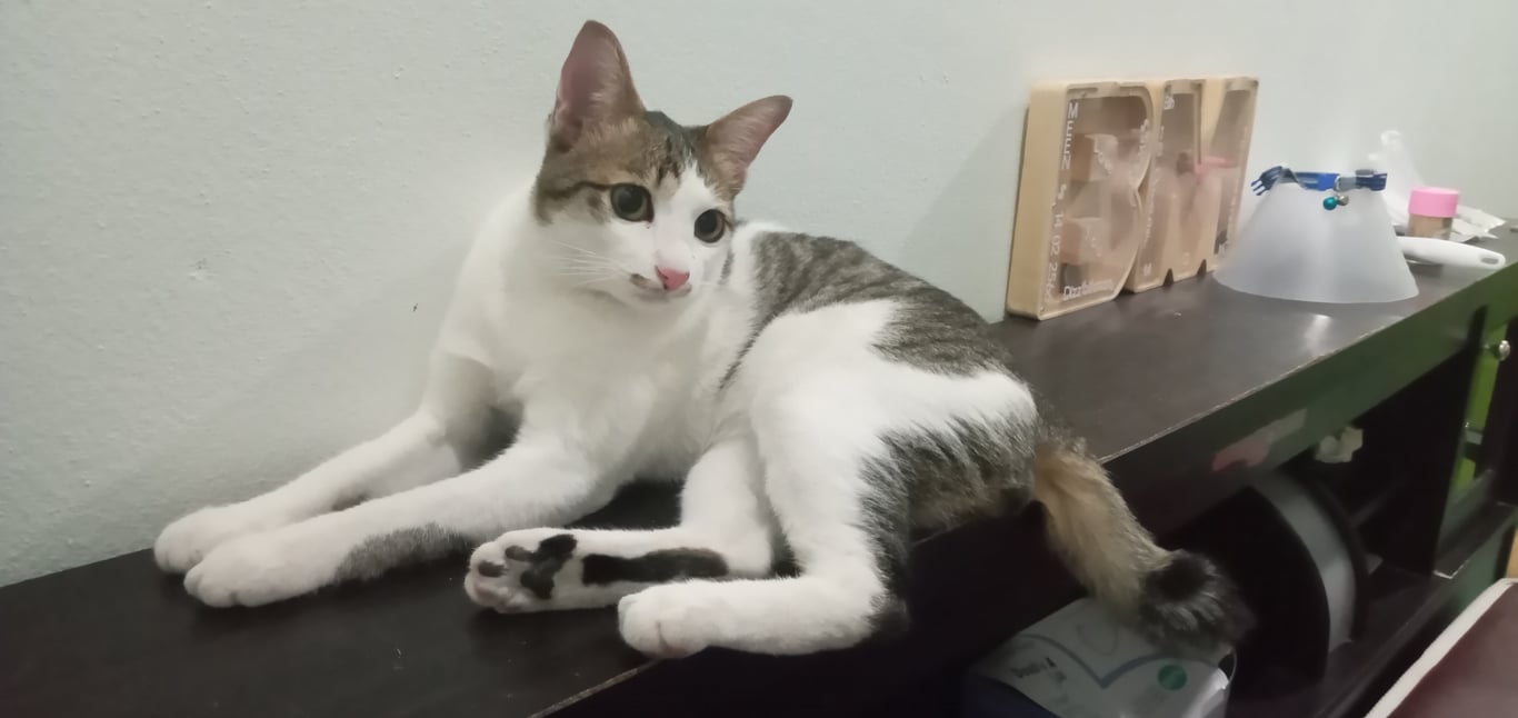 รอยตำหนิ: มีปานดำทึ่ปากล่าง หางคดตรงปลายเล็กน้อยอายุประมาณปีกว่า ใส่ปลอกคอสีฟ้ากระดิ่งสีทอง นิสัยขี้อ้อน