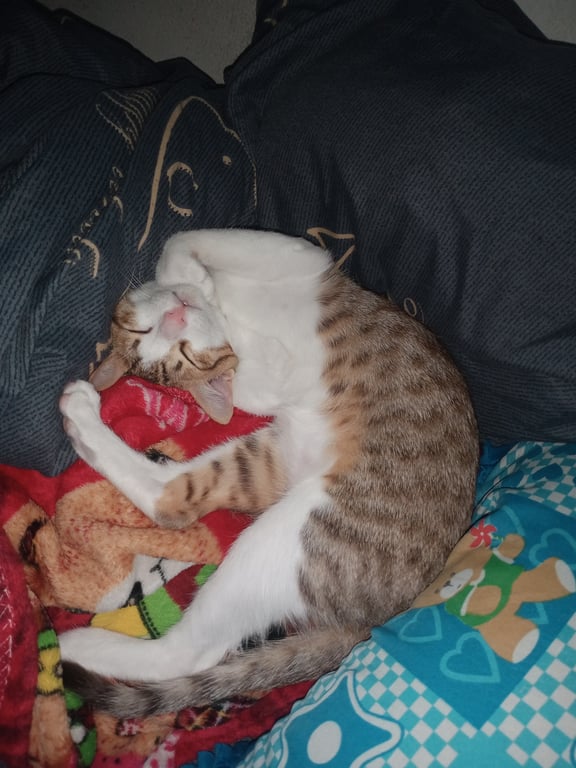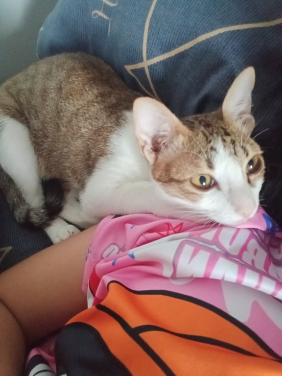 รอยตำหนิ: ลายสลิด บริเวณท้องและขาสีขาว หางฟูลายสลิด ท้องขาสีขาวแบบขาวสว่าง แก้มเป็นโหนกๆ หางฟู ขี้กลัว ชอบอ้อน ติดคน ชอบนอนบนหน้าอกเจ้าของ ขี้เล่น ชอบเล่นทิชชู่ คัตเติ้ลบัต เล่นทุกอย่างที่พอจะเล่นได้ เวลาหิวจะร้องหิ๊วๆไม่หยุดจนกว่าจะได้กิน น้องกินผักบุ้ง น้องมีแมวโตตัวผู้ที่เลี้ยงไว้คู่กัน น้องชอบทำหูบินเวลาคุยด้วย