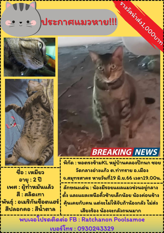 รอยตำหนิ: แผลเเมวข่วนกลางดั้งน้องไม่ส่งเสียงร้อง ค่อนข้างเชื่องคุ้นเคยกับคนแต่จะไม่ให้จับถ้าน้องกลัว กลัวถนนมาก