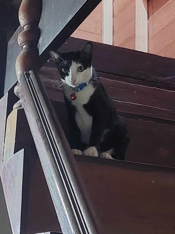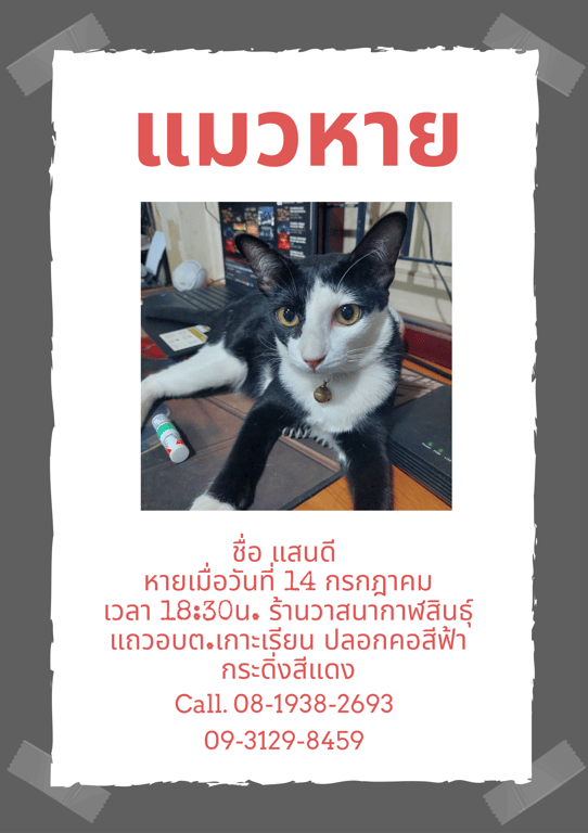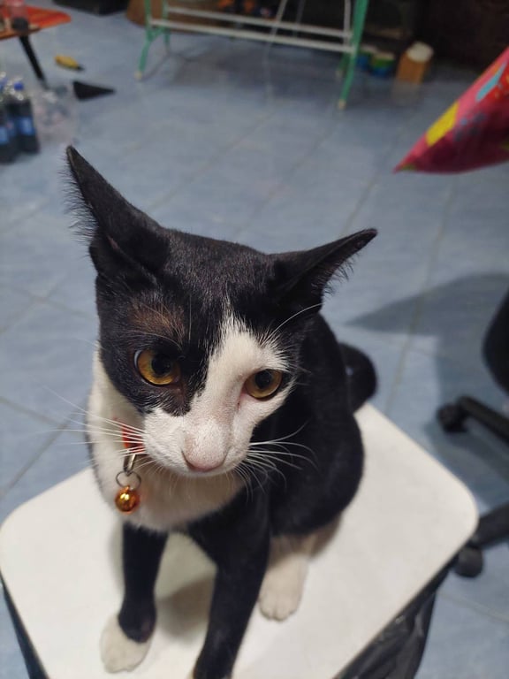 รอยตำหนิ: ตรงหน้ามีจุดตรงหน้าผาก ลายท้องลายวัว ปลอดคอสีฟ้ากระดิ่งสีแดงชอบเข้าหาคน แต่ไม่ชอบให้จับตัวพอจะจับและจะแงบ
