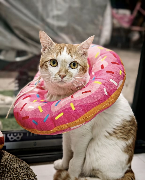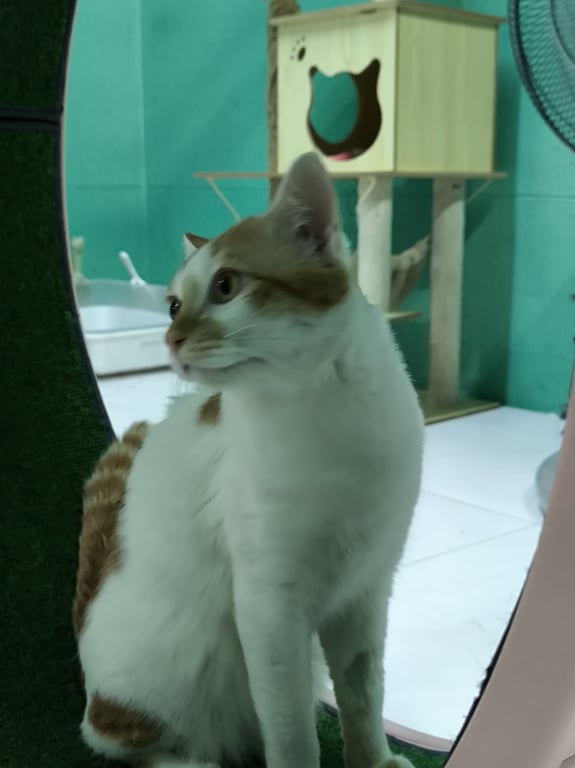 รอยตำหนิ: หางสีส้ม ท้องสีขาวน้องเป็นแมวจรมาก่อน มีนิสัยค่อนข้างซ่อนแอบและมักจะอยู่ตัวเดียว ร้องเสียงไม่ดัง กินเยอะแต่โตช้า