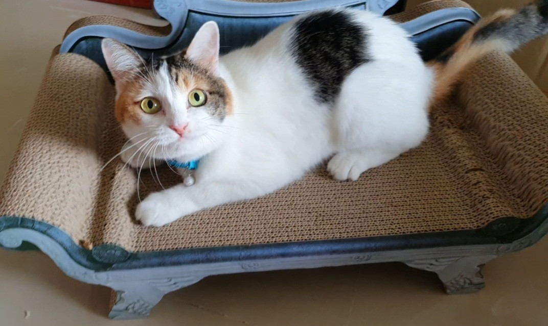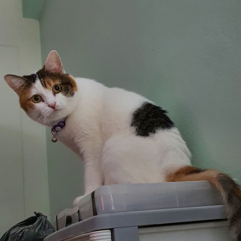 รอยตำหนิ: แมวขาวแต้มสามสี หางยาว หน้ากลมน้องเคยอยู่แต่ในห้อง ค่อนข้างกลัวคนแปลกหน้า ให้เจ้าของจับได้คนเดียว ถ้าเป็นคนอื่นน้องจะขู่ และอาจตะปบหรือกัดได้ น้องกินอาหารเม็ดโรยัลคานิน กับอาหารเปียกคานิว่า ชอบกินแมวเลีย กับเจ้าของน้องสวัสดีขอมือเป็นถ้าบอกว่า "ชีส สวัสดีค่ะ" แล้วแบมือให้น้องวางมือบนมือเรา