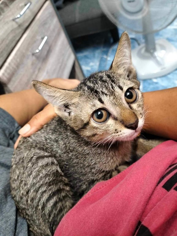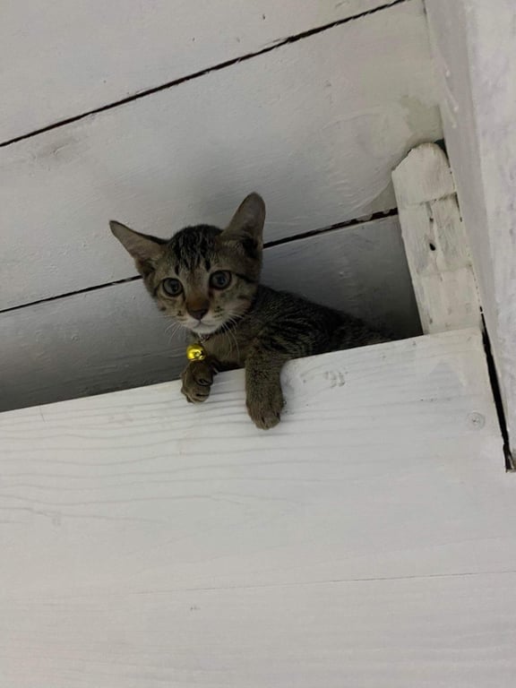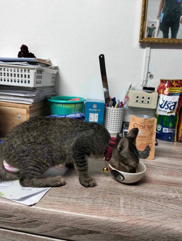 รอยตำหนิ: หางตรงยาวอายุประมาน 2 เดือน นิสัยขี้กลัว ลายสลิด ตอนหายใส่ปลอกสีแดงเลือดหมู กระดิ่งสีทอง