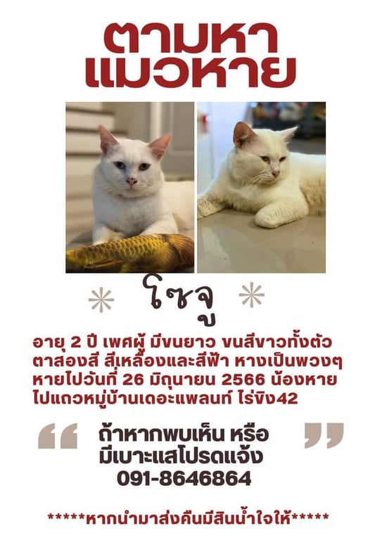 รอยตำหนิ: ตามสองสี สีเหลืองฟ้า หางเป็นพวงๆออกเหลือง ตัวสีขาวขี้กลัว