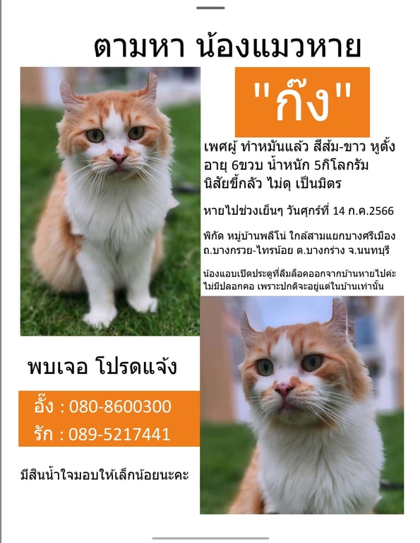 รอยตำหนิ: หูตั้งแหงนใจดี ขี้อ้อน ไม่ดุ ถ้าไม่วิ่งใส่ เค้าจะยอมให้กอด ให้อุ้ม