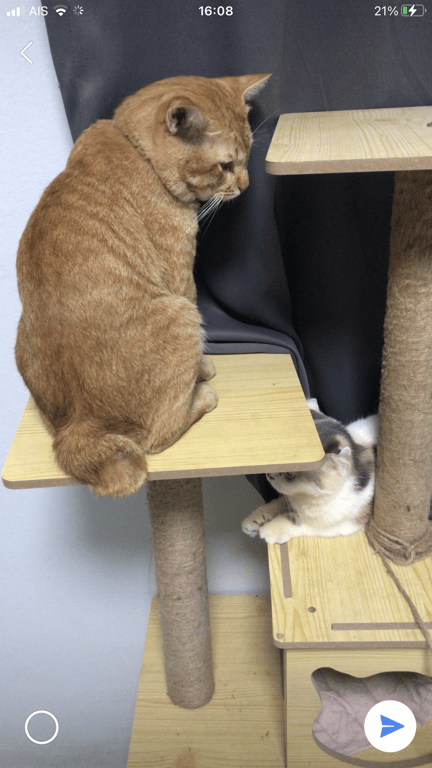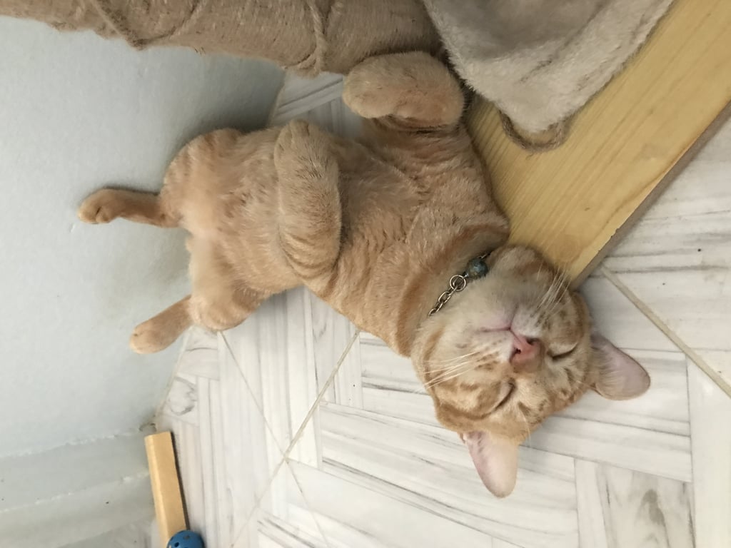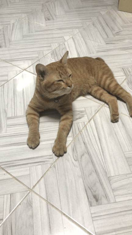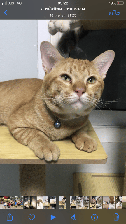 รอยตำหนิ: มีโซ่เป็นสร้อยคอกระดิ่งสีฟ้า ตัวมีสีส้มทั้งตัว มีสีขาวตรงคาง หางกุดนิสัยค่อนข้างกลัวคนแปลกหน้า ไม่ให้ใครจับง่ายๆ ย่องเบาเก่งมาก