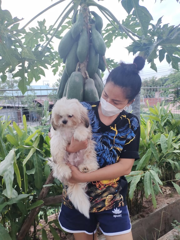 รอยตำหนิ: ขนตั้งแต่สะโพกถึงหางตัดสั้นไม่เสมอกันเพราะไฟไหม้ขนเป็นหย่อมๆจึงตัดออก แต่ยังตัดไม่เสร็จดื้อ ซน ชอบวิ่งไล่เห่าทุกอย่างที่ผ่านหน้า โดยเฉพาะรถมอเตอร์ไซค์หรือคนเดินผ่านหน้าบ้าน