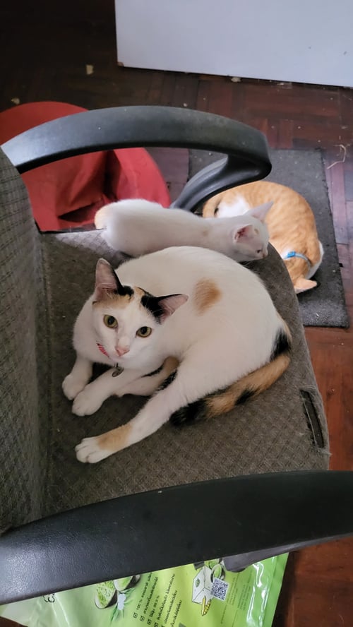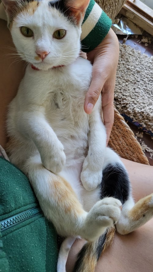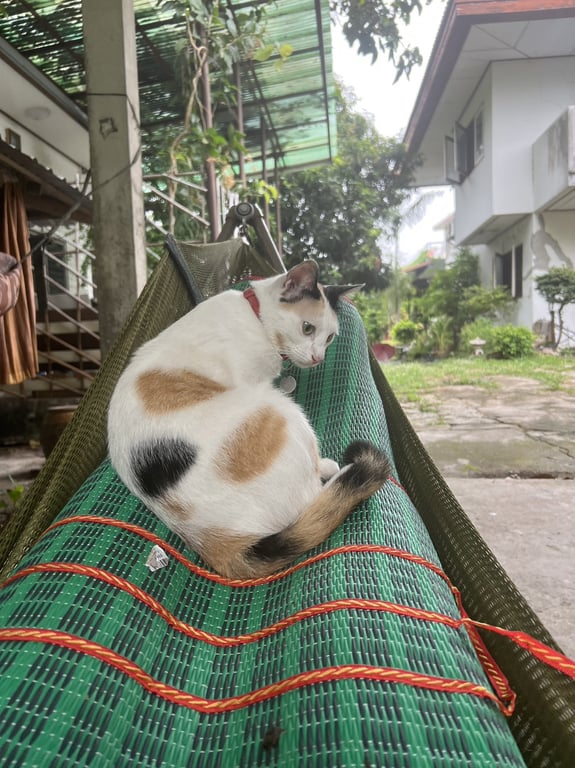 สี: สีขาว มุลายจุดสีส้ม-ดำ หางสีส้มดำ ปลอกคอสีแดง