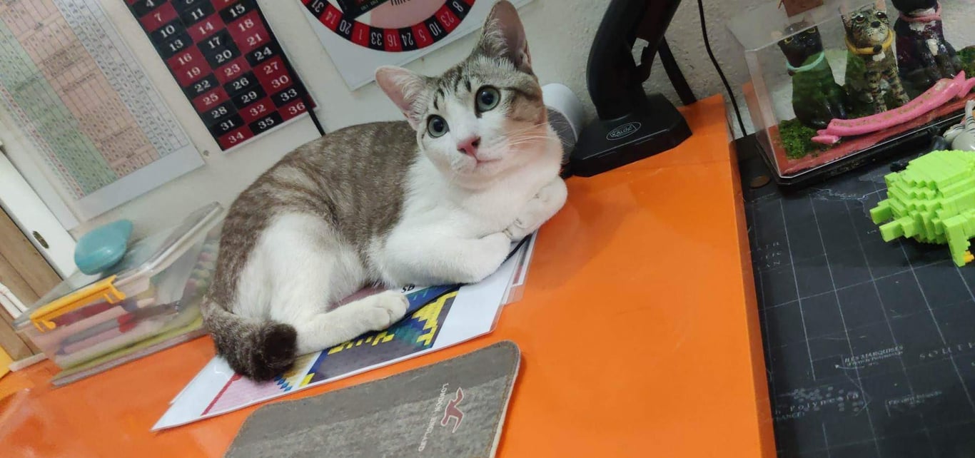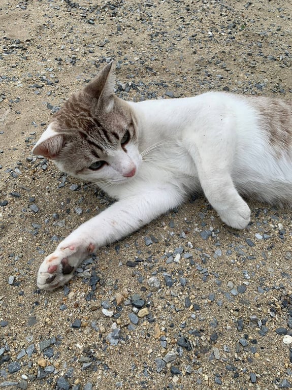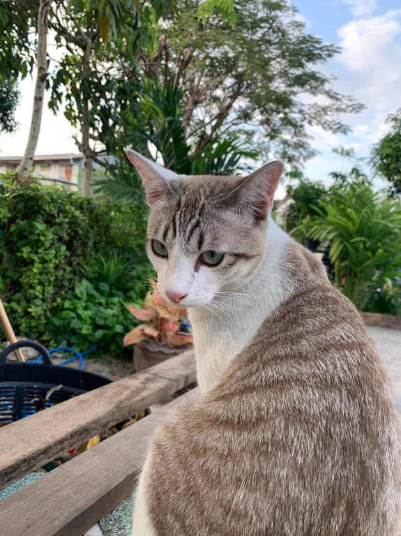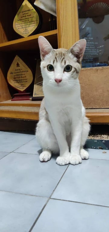 รอยตำหนิ: หางงอ มีปานที่อุ้งเท้าขวาหน้า เท้าขวาด้านหลัง และไข่สองสีอดีตเป็นแมวจร ชอบนอน นิสัยไม่กลัวคน ชอบเล่นกับคน