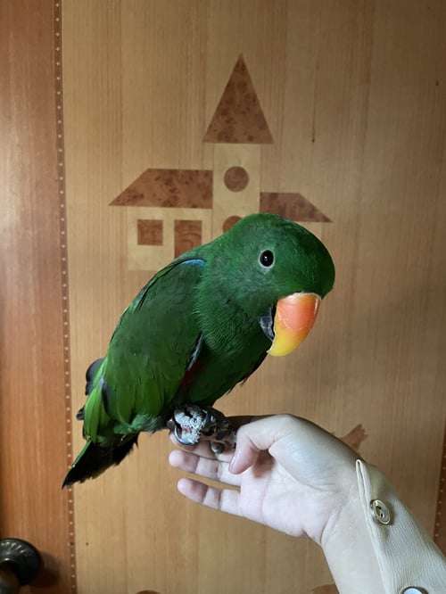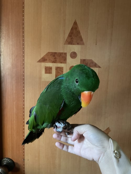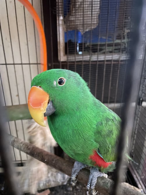 รอยตำหนิ: เขียว ปีกมีสีแดงนิดๆ มีห่วงขาเบอร์โทร3 ปี เปิดกรงหนีไปเอง พูดได้นิดหน่อย