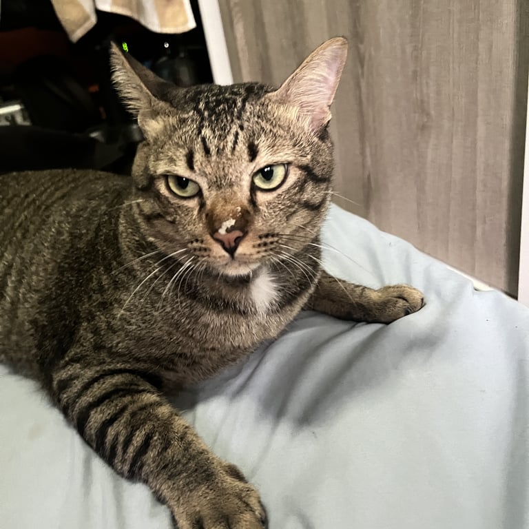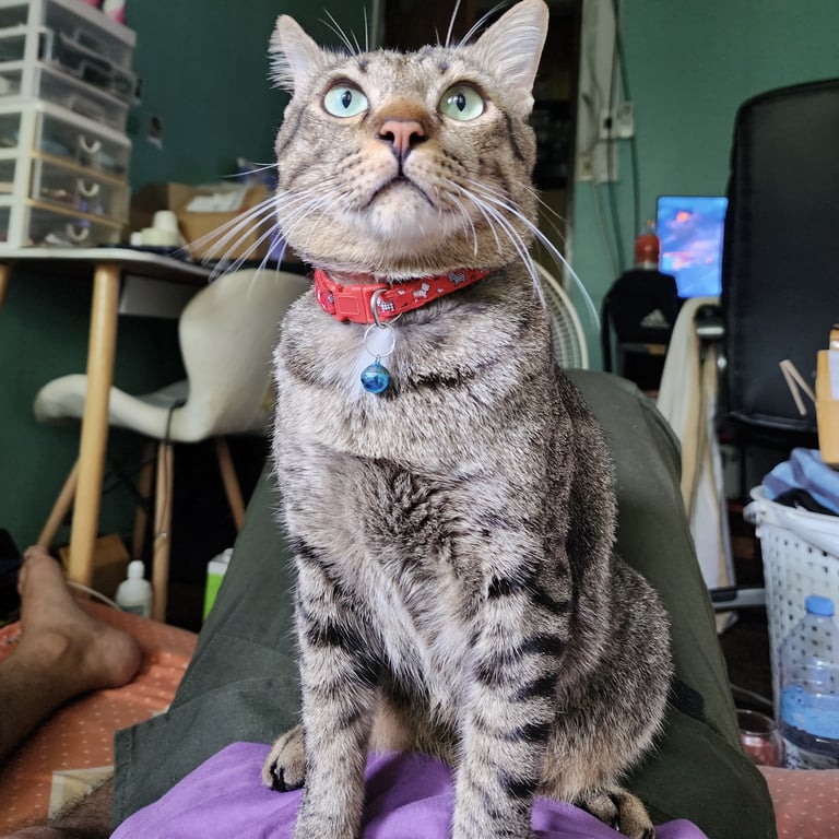 รอยตำหนิ: มีขนสีขาวตามแนวยาวตรงกระดิ่งบนปลอกคออายุ3ปี เป็นแมวค่อยข้างอ้วน สังเกตจะมีพุงย้อยลงมาหน่อย นิสัยดุร้าย ไม่ชอบให้คนสัมผัส อาจจะกัดได้ ถ้าไม่ใช่เจ้าของ ใส่ปลอกคอสีแดงกระดิ่งฟ้า