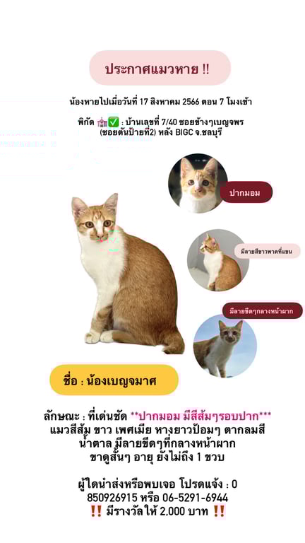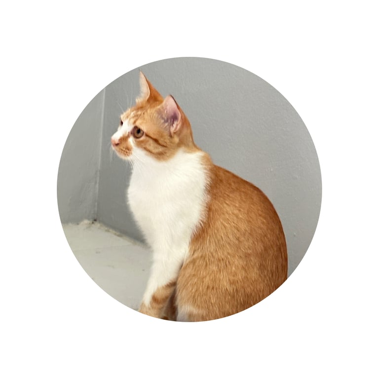 รอยตำหนิ: ปากมอม(สีส้ม) , ลายขีดๆกลางหน้าผาก , ขนสีขาวพาดข้างลำตัว , ขาสั้นๆ , หางป้อมๆนิสัยขี้กลัว ไม่ดุ ขี้อ้อน