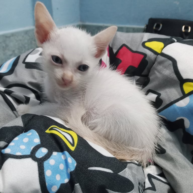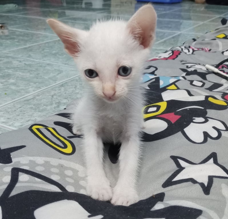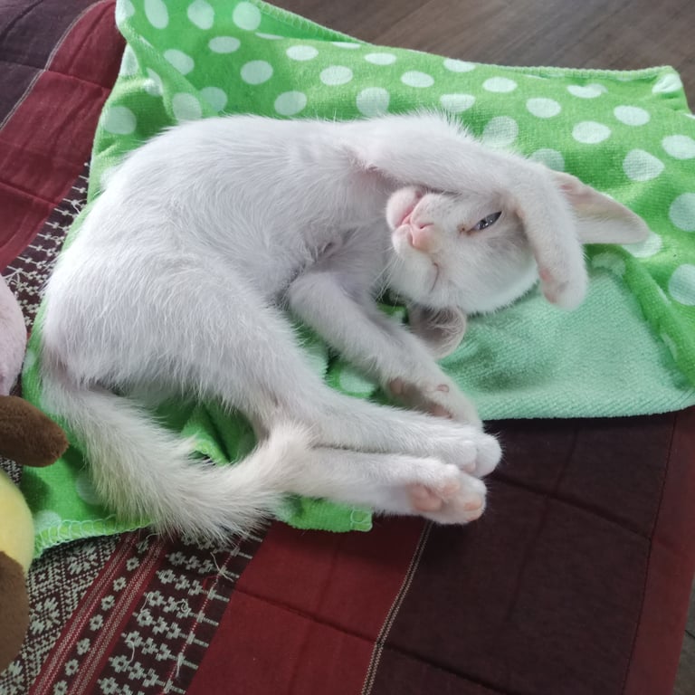 สี: ตัวสีขาว หางสีส้ม ตาสีฟ้า