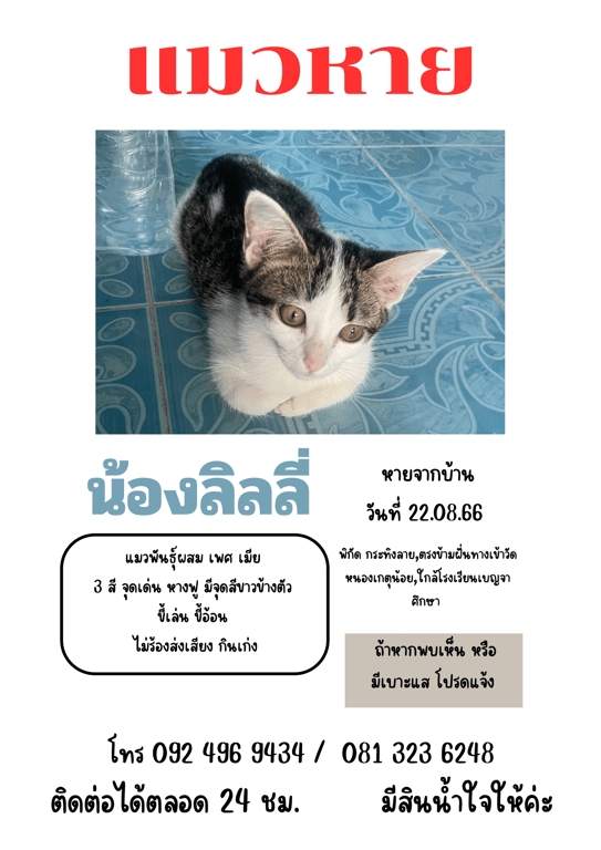รอยตำหนิ: ข้างลำตัวมีจุดสีขาว ไม่ใส่ปลอกคอขี้อ้อน ไม่ชอบส่งเสียง กินเก่ง ชอบถูกตัวให้โดนมือ