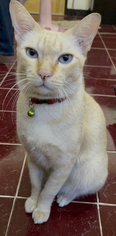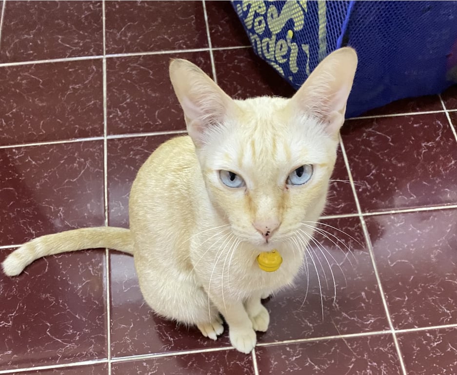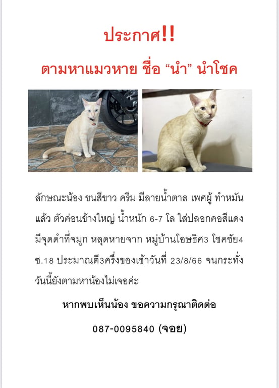 รอยตำหนิ: จมูกและริมฝีปากมีกระสีดำตัวน้องค่อนข้างใหญ่ อวบๆ หางยาว น้ำหนักประมาณ 6-7 โล อายุ 4 ปีตอนหายน้องใส่ปลอกคอสีแดงมีกระดิ่ง
