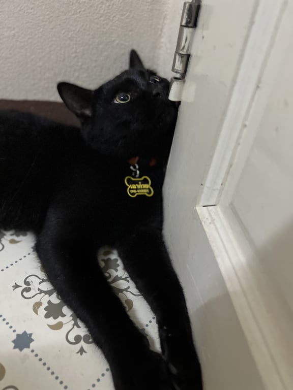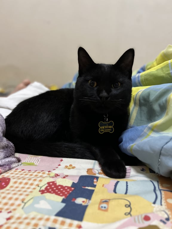 รอยตำหนิ: น้องไม่มีตำหนิเลยสีดำล้วนดำทุกอย่างเท้าดำทั้งหมดน้องชื่อเฉาก๊วยจะมีปอกคอสีส้มมีป้ายชื่อและเบอร์โทเจ้าของอยู่ น้องเป็นแมวเปอร์เซียผสมไทย