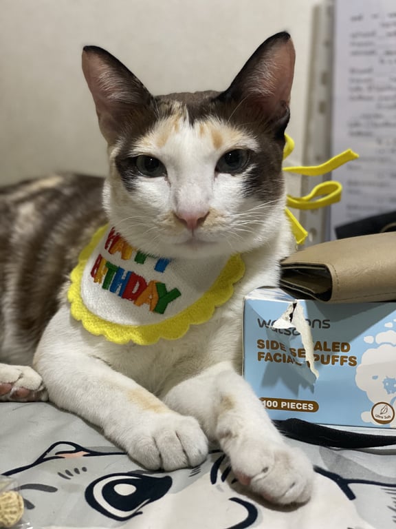 รอยตำหนิ: บนหัวระหว่างหู เป็นรูปหัวใจสีน้ำตาลวันที่หายใส่ปลอกคอลายเสือดาว มีair tagสีแดงเข้มติดที่คอ