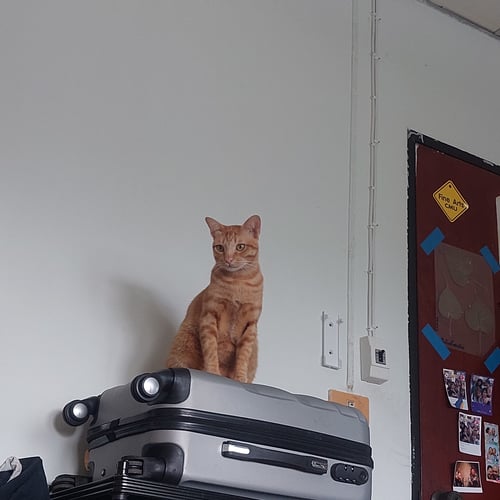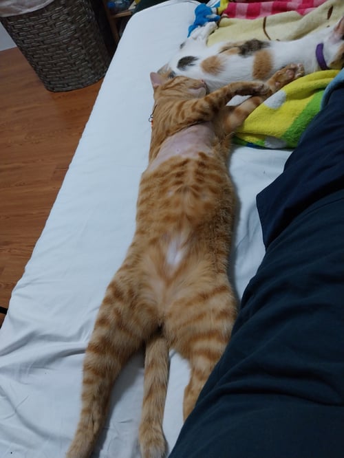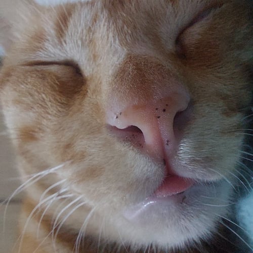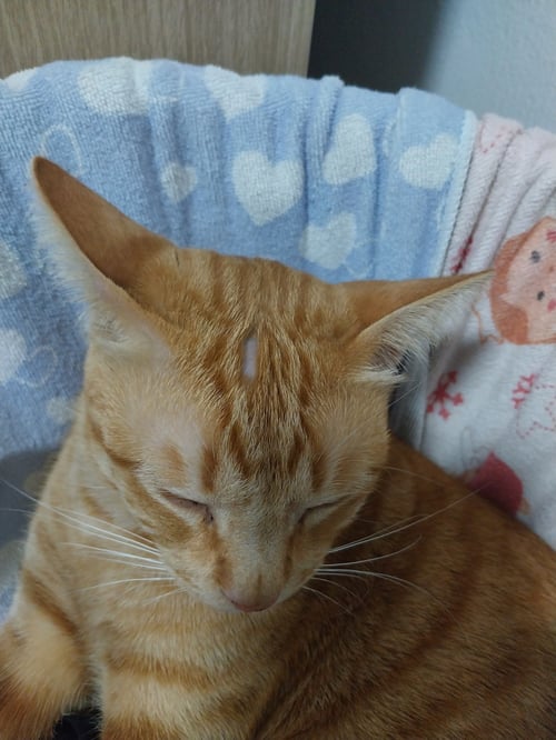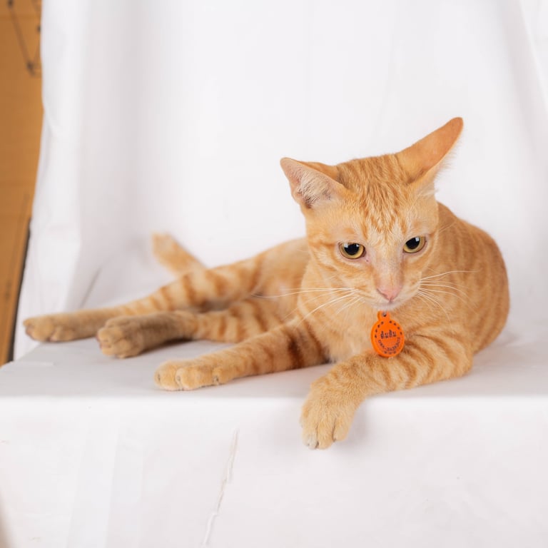 รอยตำหนิ: สีส้มเข้มทั้งตัว มีแต้มขาวที่ท้องช่วงล่าง มีปานเม็ดสีดำที่จมูกร้องเสียงดัง กลัวคน ขนตรงหัวแหว่งไปหนึ่งหย่อม ปลายหางคด(ต้องลูบดู) หนวดขวามีหนึ่งเส้นโคนเป็นสีดำ