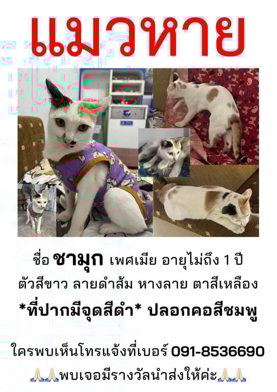 รอยตำหนิ: มีจุดสีดำที่ปาก ตาสีเหลือง หางลาย ปลอกคอสีชมพู