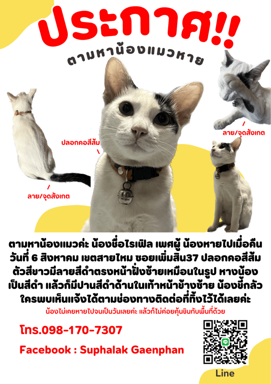 รอยตำหนิ: มีลายสีดำตรงหน้าด้านซ้าย และปานขาหน้าข้างซ้ายด้านในน้องขี้กลัว ตกใจง่าย ไม่ชอบเสียงดัง