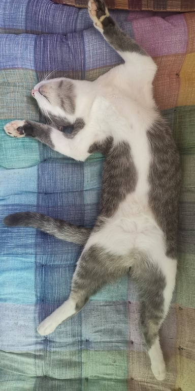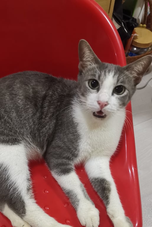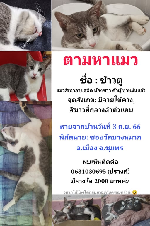 รอยตำหนิ: ใต้คางมีลาย มีสีขาวใต้ท้องช่วงตรงกลางลำตัวแคบชอบถูเท้าเป็นพิเศษ ไม่ชอบให้อุ้ม รู้ชื่อตัวเองเรียกชื่อแล้วกัน ชอบให้เอามือลูบที่แก้ม