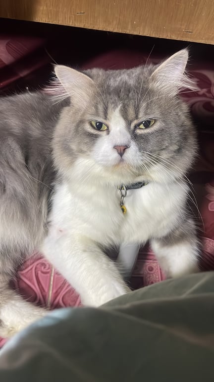 รอยตำหนิ: โกรนขนที่หางเพราะน้องเป็นเชื้อรา เหลือแค่ปลายหางเป็นพุ่มอยู่หน่อยนึ่ง จมูกจะสีน้ำตาลปนสีชมพูมีนิสัยติดเจ้าของ ไม่เคยกัดคน น้องรู้ชื่อตัวเอง ค่อนข้างจะเลือกกิน
