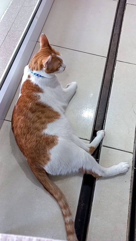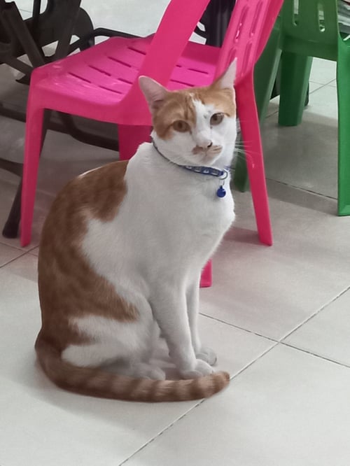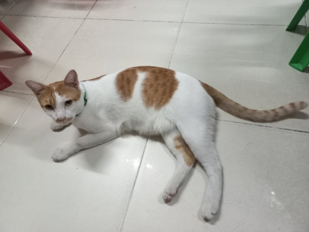 รอยตำหนิ: ลายสลิดบนหัว แหวกขาวที่หน้าผาก หางยาวเป็นแมวขี้อ้อน ชอบเล่น ไม่ดุ