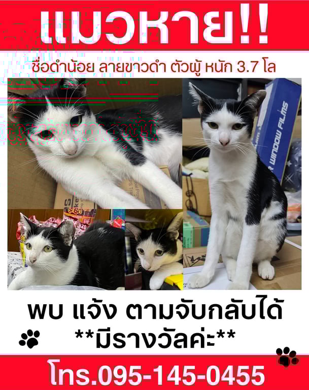 รอยตำหนิ: แมวสีขาวดำ ตาสีเหลือง น้ำหนัก3.7โล(ก่อนแมวหาย) สีดำที่หลังแมวเยอะกว่า หน้าแมวสีขาวขี้เล่นนิดหน่อย ชอบแอบกินแมลง ชอบให้เกาคอ เจอคนแปลกหน้าอาจจะหนี หายตอนวันเสาร์ 29 ก.ค. 66 ช่วงประมาณเที่ยงบ่ายๆ พิกัดหาย:ใกล้ๆโรงงาน ลำปางเจริญศิลป์ หรือหายที่บ้านเจ้าของ ต.นาครัว อ.แม่ทะ จ.ลำปาง เบอร์ติดต่อ 095-145-0455 หรือติดต่อเบอร์ 088-252-8447